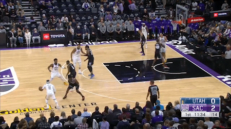 When driving, the way the help reacts is much different from the beautiful spacing the Jazz always maintains. Here the slot drive draws corner help from Capela, and that advantage is maintained with an extra pass to Conley and ending up with the 3 ball from Markannen.